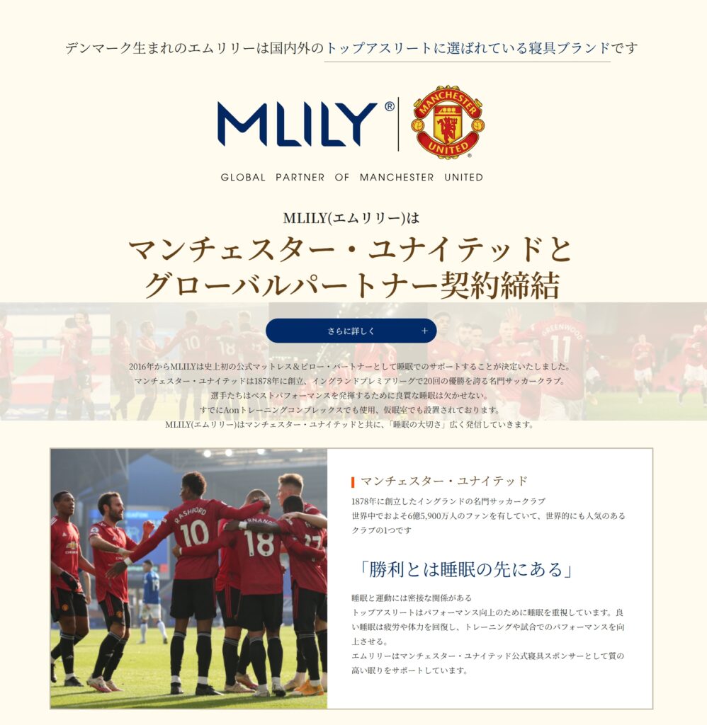 MLILYの品質を最も象徴するのが、世界的なビッグクラブ「マンチェスター・ユナイテッド」の公式マットレス・ピローパートナーであることです。